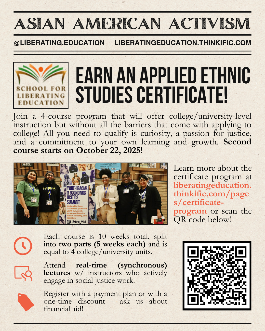 The School for Liberating Education (SLE) is an autonomous educational space that offers knowledge that advances social and ecological justice. It is rooted in Ethnic Studies, an interdisciplinary field of study taught mainly at the college and university-level. Ethnic Studies was the result of student-led social justice movements in the late 1960s and early 1970s across the country. In the handful of colleges and universities where Ethnic Studies was established, it became increasingly unavailable to the communities it was originally meant to serve. SLE offers college/university-level ethnic studies, including a certificate in Applied Ethnic Studies, without the restrictive admissions requirements or high costs that ordinarily come with college/university education. It also creates space for decolonial, reindigenized knowledge shared by educators who have worked both inside and outside traditional educational systems. Moreover, SLE's pedagogy is grounded in collective care and radical love and thus centers care for one another as well as care for Mother Earth in its approach to teaching.